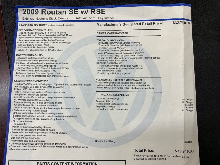 2009 Volkswagen Routan SE, Nocturne Black on Aero Gray, 2 Owner, Clean Carfax, Rear Entertainment W/ Headphones & Remote, Heated Front Seats, Back-Up Camera, Power Lift-Gate, Remote Power Sliding Doors, Remote Start, 2nd & 3rd Row Stow an go Seating, Power Drivers Seat, CD Player,