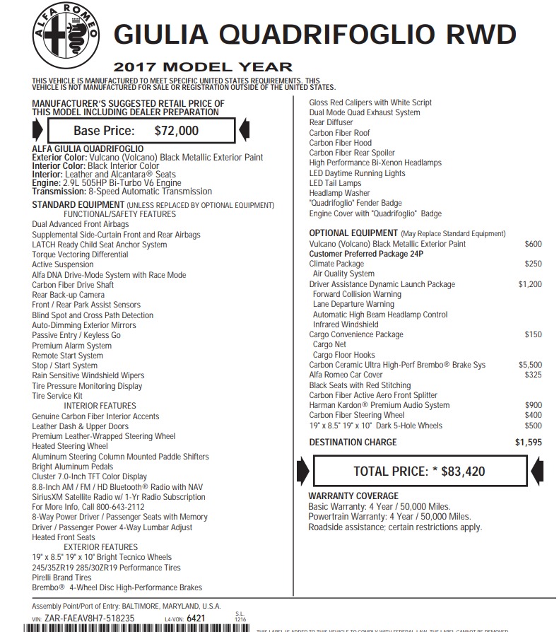 2017 Alfa Romeo Giulia Quadrifoglio, 505HP!! Volcano Black Metallic with Black Leather, Carbon Ceramic Ultra High-Perf Brembo Brakes, Remus Custom Exhaust System, Carbon Fiber Steering Wheel, Driver Assistance Dynamic Launch Package,Harman Kardon Audio System,