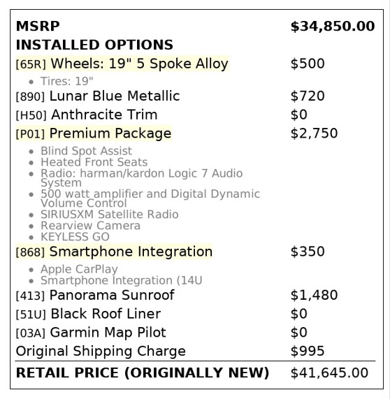 - Marketing Package : Premium Package (Includes blind spot assist, harman/kardon LOGIC7 surround sound, rearview camera, KEYLESS-GO, heated front seats, and SiriusXM radio.)