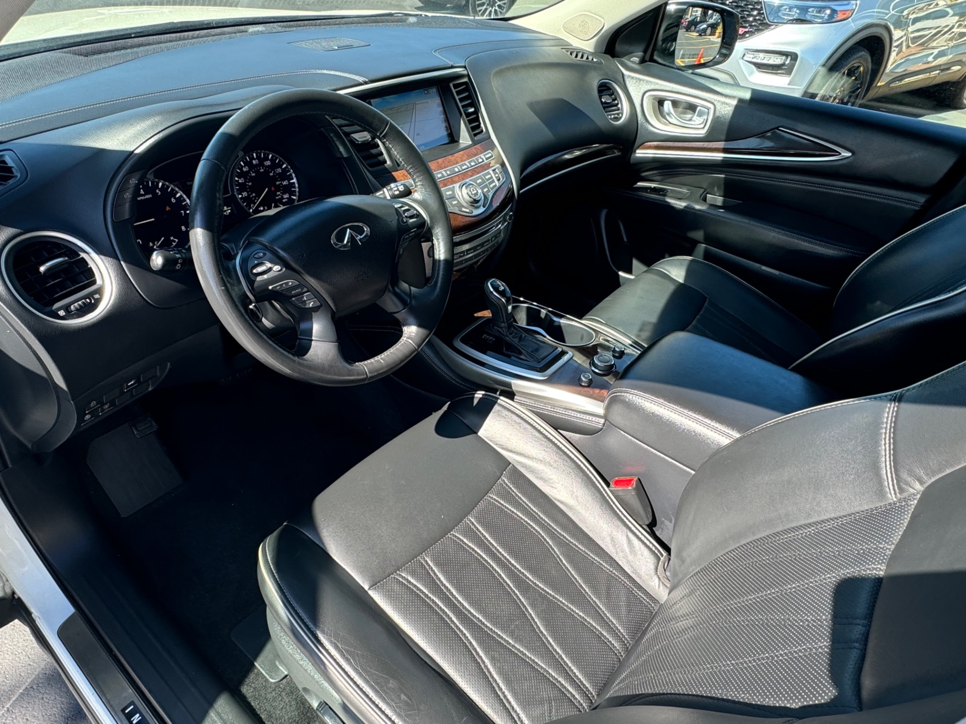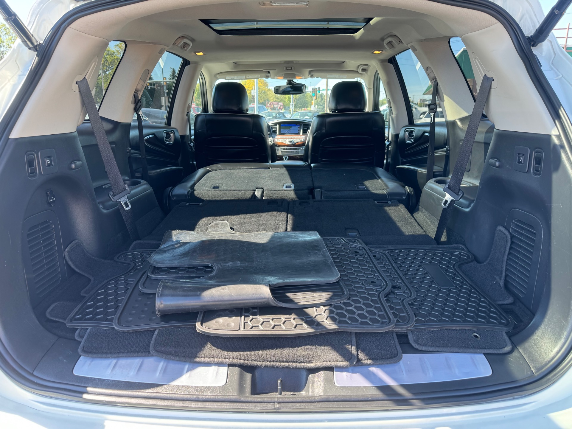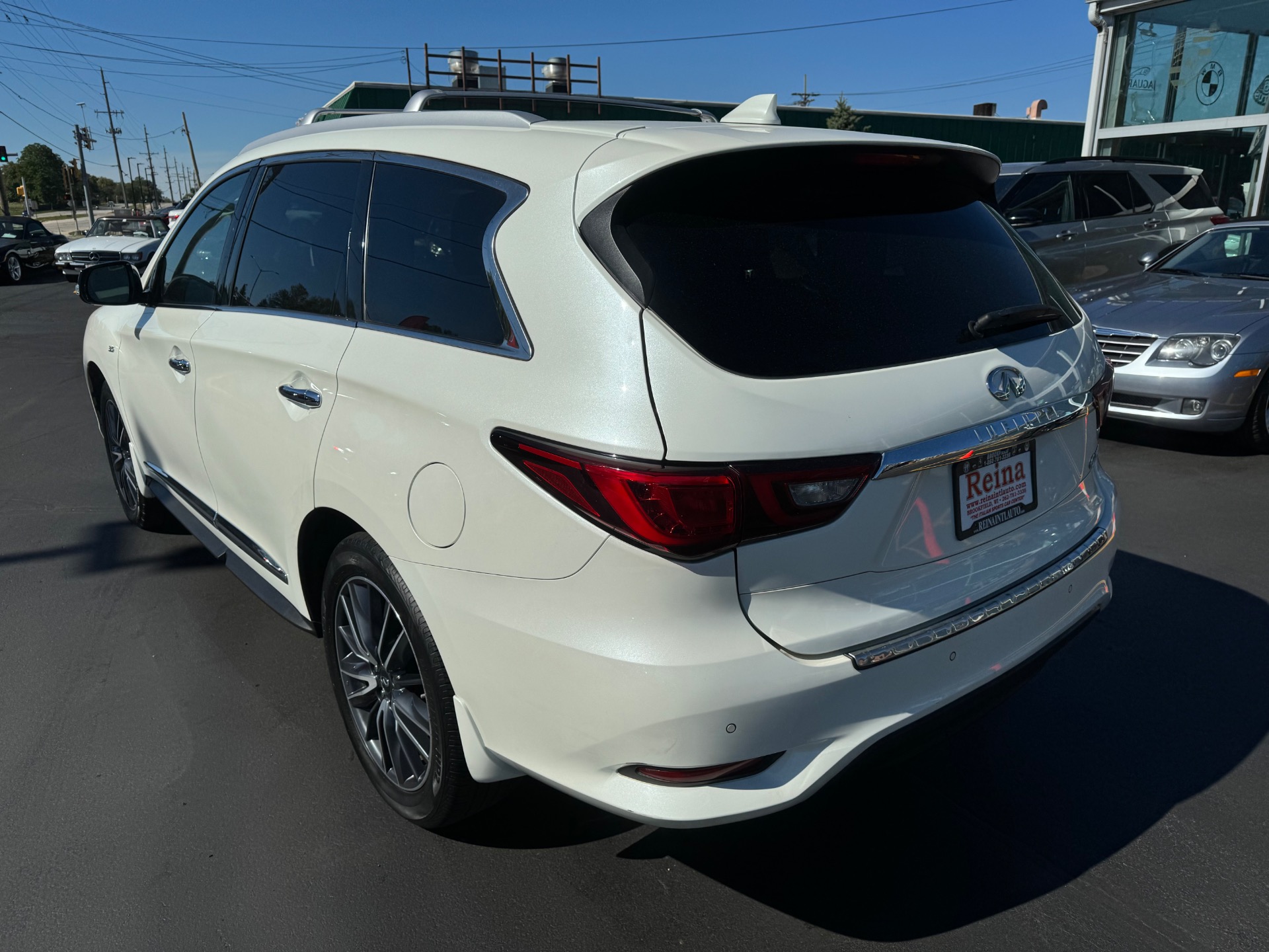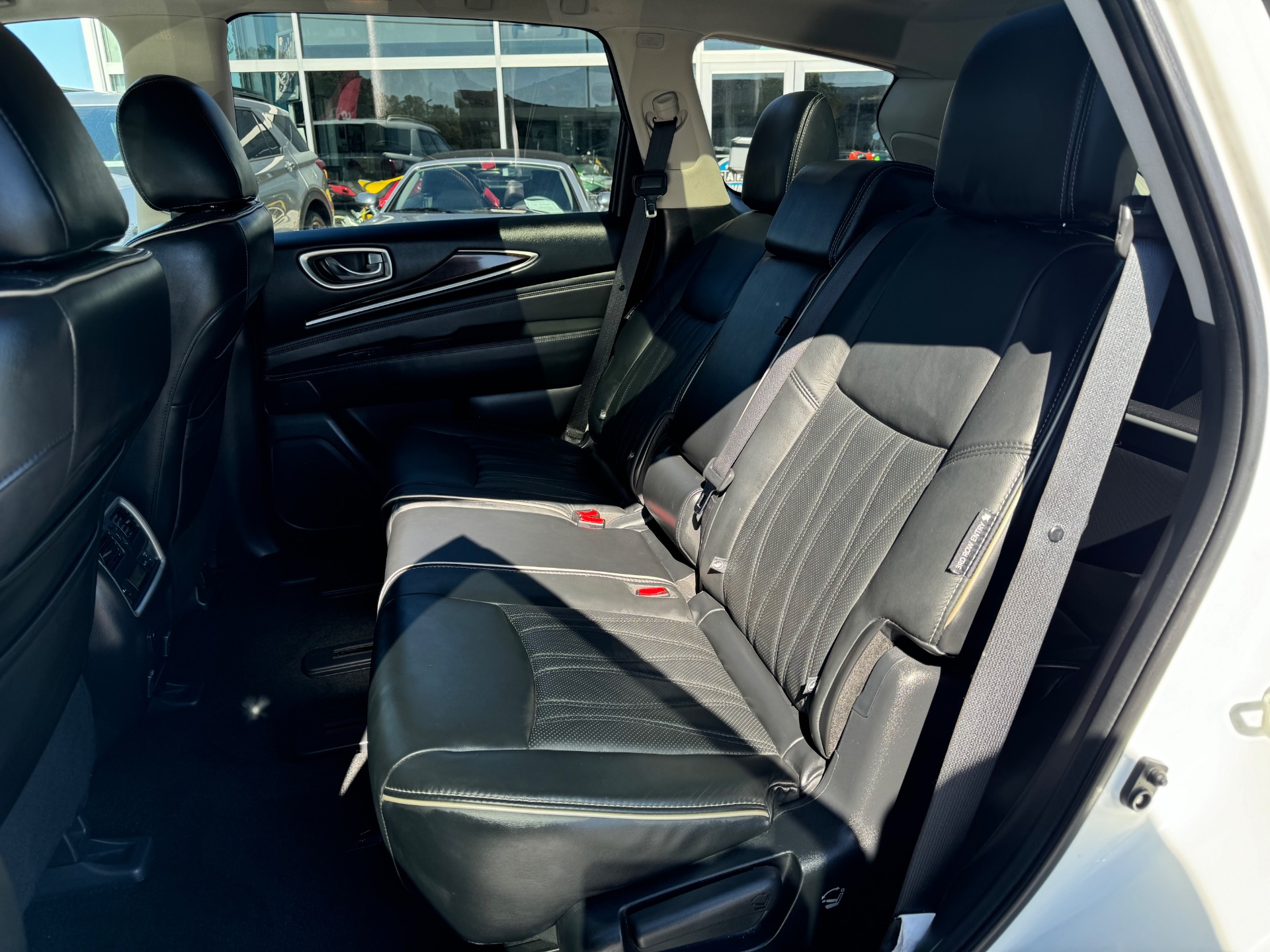 2018 INFINITI QX60 AWD, Majestic White on Graphite Leather, Over $59K New Sticker Price, Deluxe Technology PKG, Premium Plus PKG, Premium PKG, Infiniti Intouch Navigation System with lane guidance, voice recognition, and 3-D building graphics, Infiniti Intouch services, SiriusXM traffic and travel link, single in-dash CD player, Around View Monitor with Moving Object Detection and Front and Rear Sonar System, rain-sensing front windshield wipers, and illuminated kick plates, Bose 13 speaker Premium Audio system, AM/FM/CD/DVD with MP3 playback capability, Radio Data System, speed-sensitive volume control, streaming audio via Bluetooth, heated steering wheel, remote start, 2-way power lumbar support for driver's seat, easy entry/exit for driver's seat, Intelligent Key-linked dual occupant memory for driver's seat, steering wheel, exterior mirrors, audio settings, climate control, and navigation settings, exterior mirrors with reverse tilt-down, roof rails, and bumper protector, Bose Cabin Surround sound system with 5.1 decoding, 15 speakers, climate-controlled front seats, heated second row outboard seats, unique quilting for first and second rows, third row seat back power return, maple interior accents, advanced climate control system with auto recirculation, plasmacluster air purifier, and grape polyphenol filter, intelligent cruise control, second and third row moonroof with power rear sunshade, high beam assist, lane departure warning, lane departure prevention, blind spot warning with blind spot intervention and backup collision intervention, distance control assist, front and rear sonar sensors, forward collision warning with emergency braking and pedestrian detection, active trace control, Eco pedal, front pre-crash seatbelts, motion activated liftgate, auto-dimming side mirrors, cross bars, and 20 in. aluminum alloy wheels