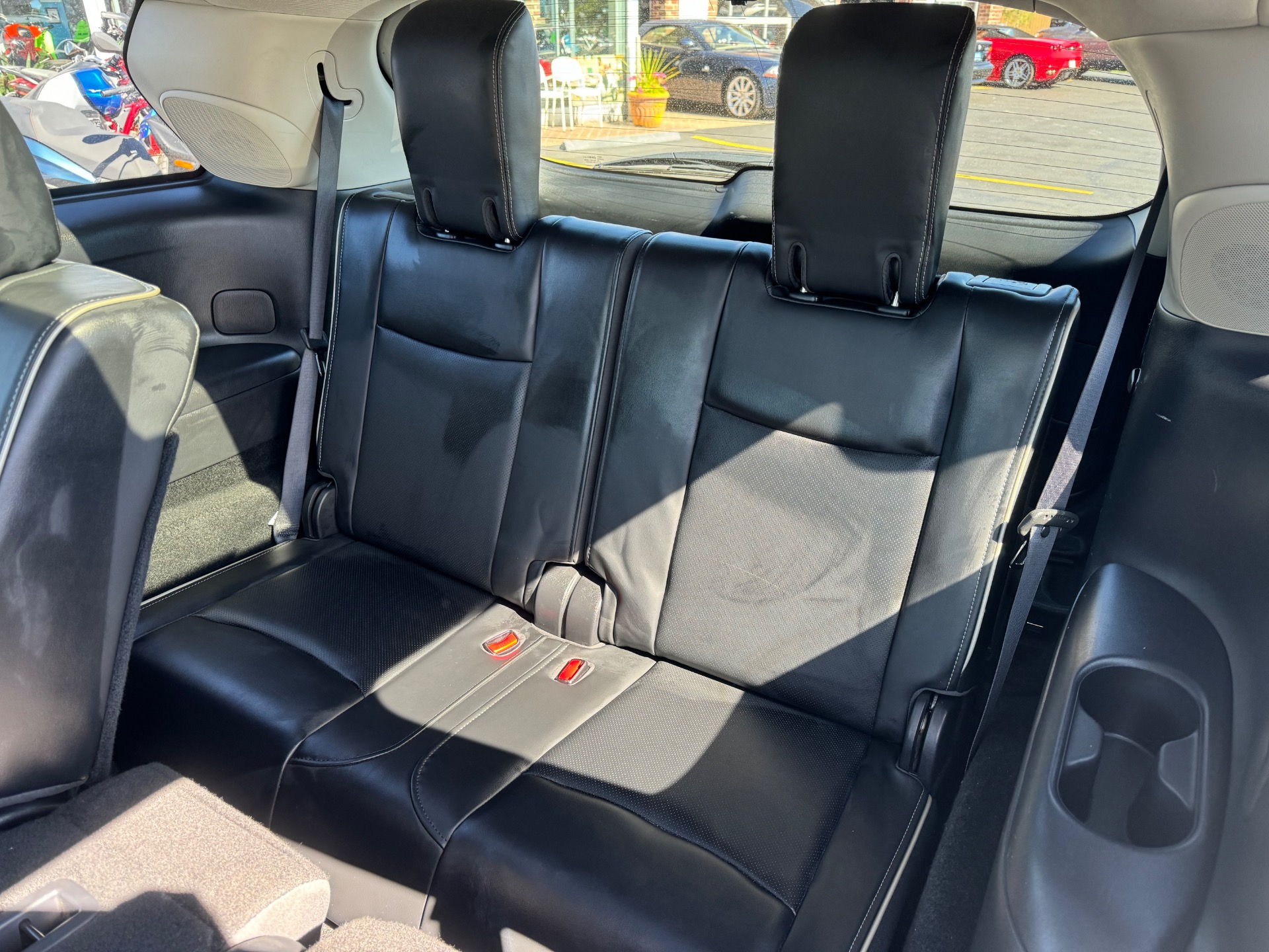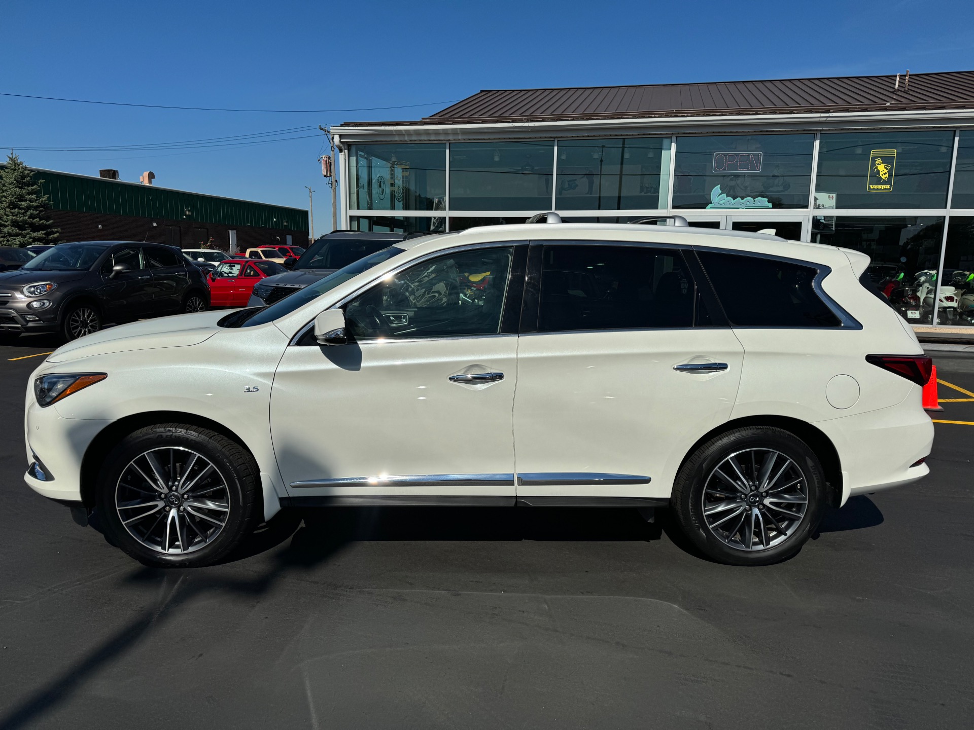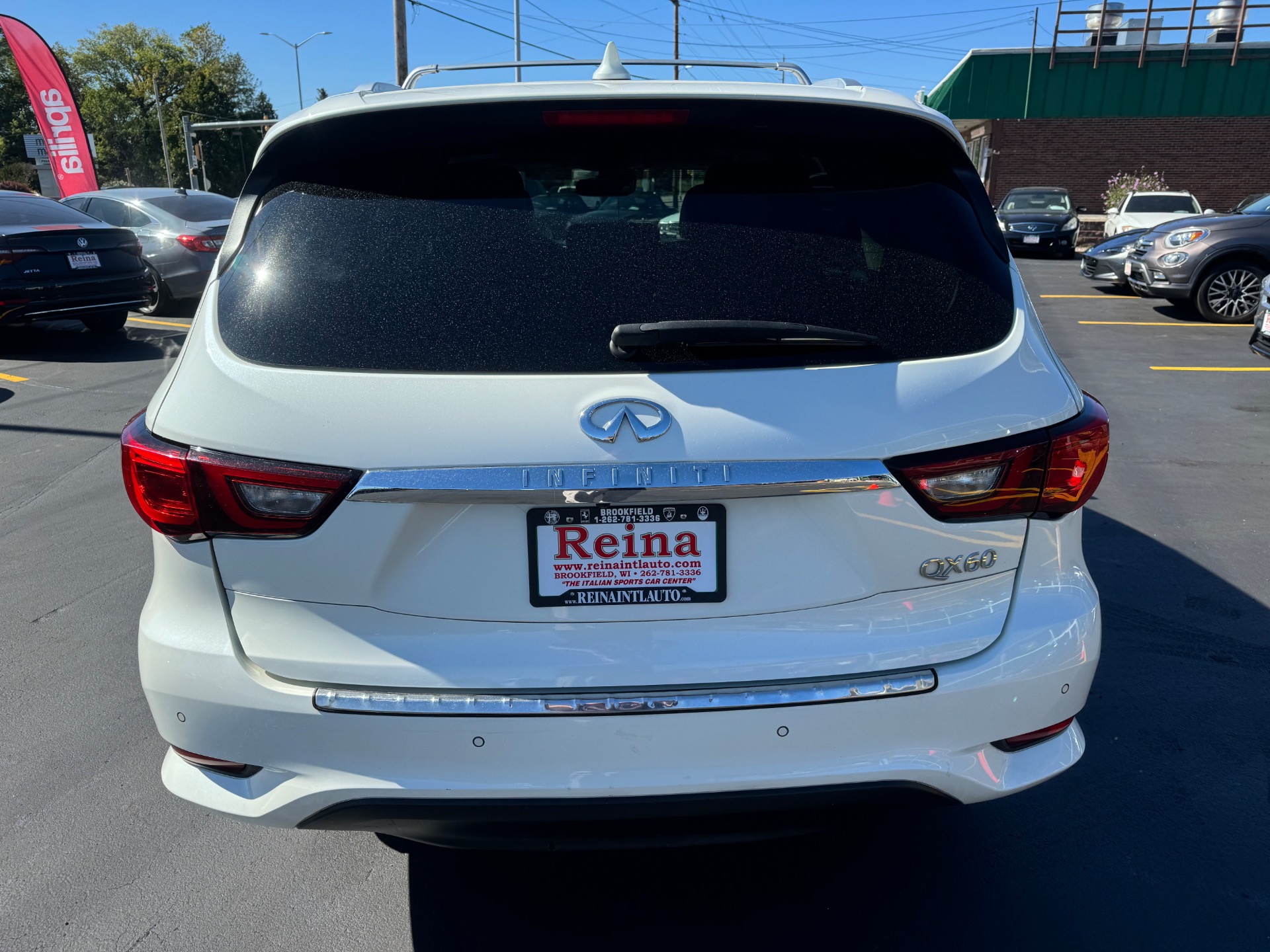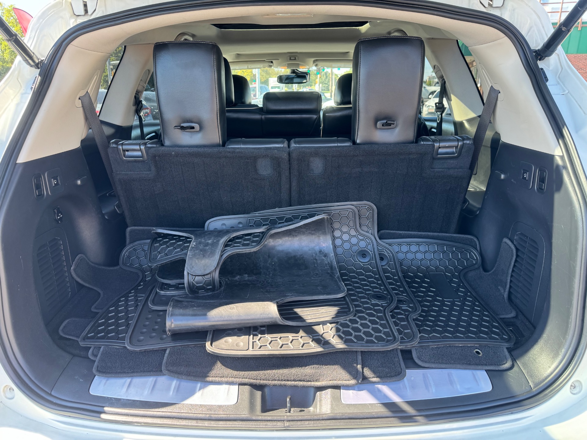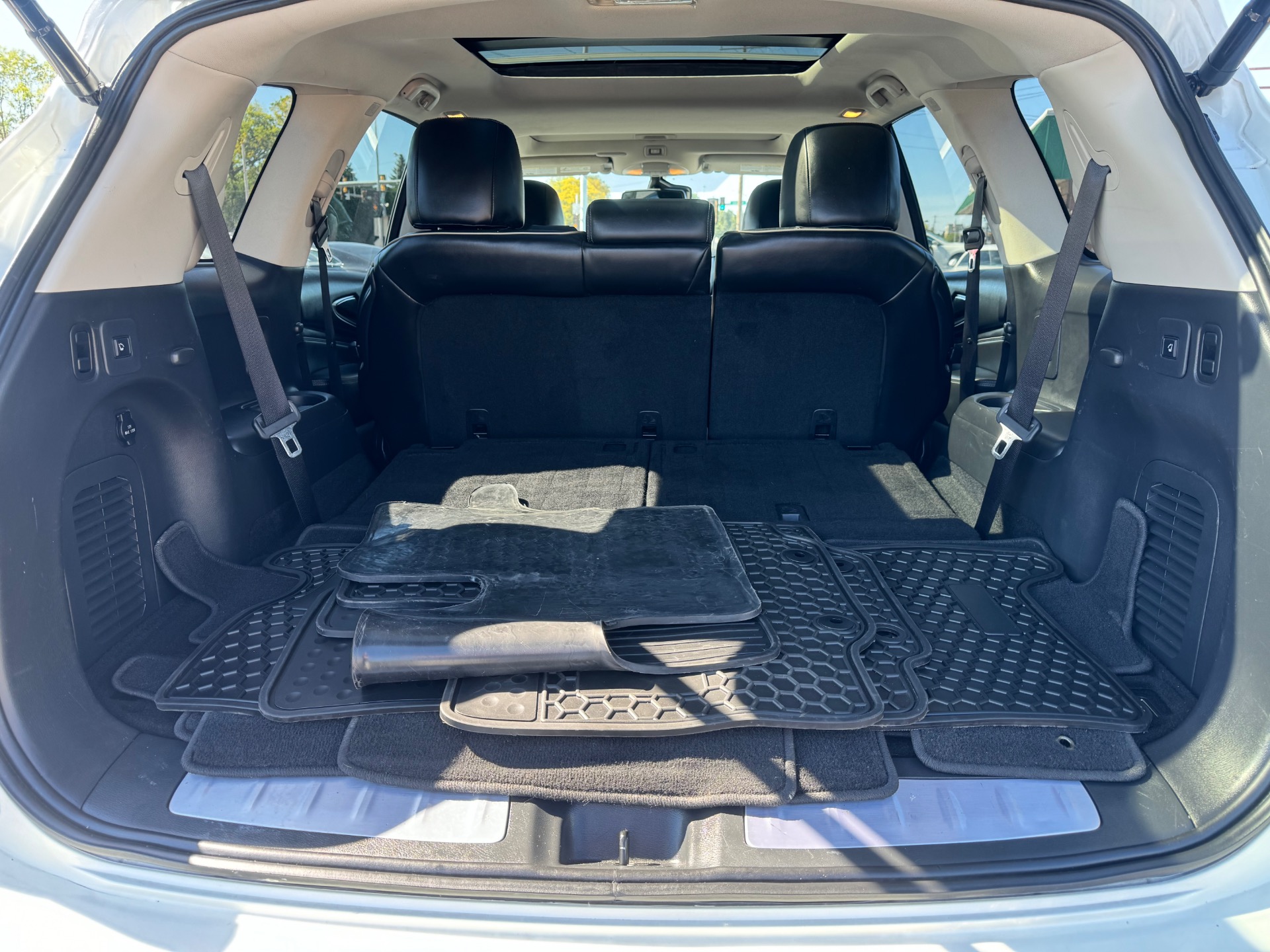 2018 INFINITI QX60 AWD, Majestic White on Graphite Leather, Over $59K New Sticker Price, Deluxe Technology PKG, Premium Plus PKG, Premium PKG, Infiniti Intouch Navigation System with lane guidance, voice recognition, and 3-D building graphics, Infiniti Intouch services, SiriusXM traffic and travel link, single in-dash CD player, Around View Monitor with Moving Object Detection and Front and Rear Sonar System, rain-sensing front windshield wipers, and illuminated kick plates, Bose 13 speaker Premium Audio system, AM/FM/CD/DVD with MP3 playback capability, Radio Data System, speed-sensitive volume control, streaming audio via Bluetooth, heated steering wheel, remote start, 2-way power lumbar support for driver's seat, easy entry/exit for driver's seat, Intelligent Key-linked dual occupant memory for driver's seat, steering wheel, exterior mirrors, audio settings, climate control, and navigation settings, exterior mirrors with reverse tilt-down, roof rails, and bumper protector, Bose Cabin Surround sound system with 5.1 decoding, 15 speakers, climate-controlled front seats, heated second row outboard seats, unique quilting for first and second rows, third row seat back power return, maple interior accents, advanced climate control system with auto recirculation, plasmacluster air purifier, and grape polyphenol filter, intelligent cruise control, second and third row moonroof with power rear sunshade, high beam assist, lane departure warning, lane departure prevention, blind spot warning with blind spot intervention and backup collision intervention, distance control assist, front and rear sonar sensors, forward collision warning with emergency braking and pedestrian detection, active trace control, Eco pedal, front pre-crash seatbelts, motion activated liftgate, auto-dimming side mirrors, cross bars, and 20 in. aluminum alloy wheels