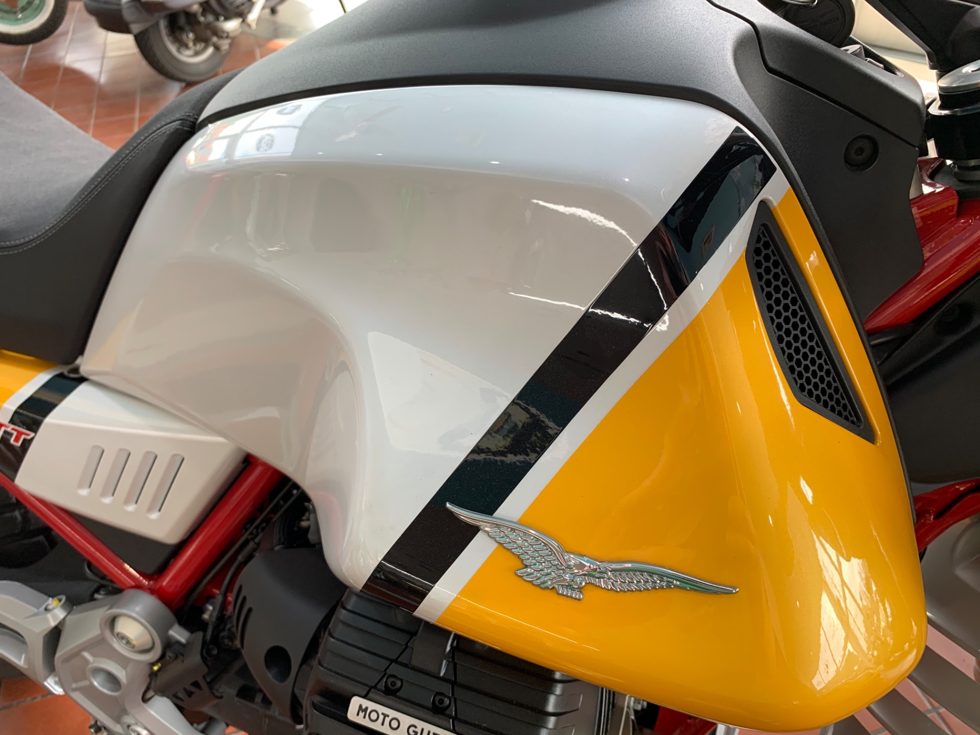 The V85 TT Advenure version stands out for its red painted frame, the double coated components and the Skai (Perforated Suede effect) saddle that includes the Moto Guzzi logo stitched with grey thread and the double needle sewing. It also mounts more profiled tires for an off-road look and feel and the fork protection in the same color as the fuel tank.